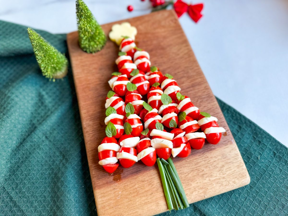 Charmosa e deliciosa, essa árvore caprese é uma entrada perfeita para deixar sua Ceia ainda mais especial. Com poucos ingredientes, traz frescor e um visual que chama atenção, unindo tomate-cereja, queijo, ervas e muita criatividade.