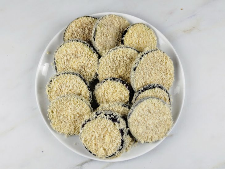 Finalize na farinha panko, pressionando levemente para garantir que tudo grude muito bem. Ela vai conferir uma crocância extra e uma textura leve ao empanado. Repita esse processo com todas as fatias de berinjela;