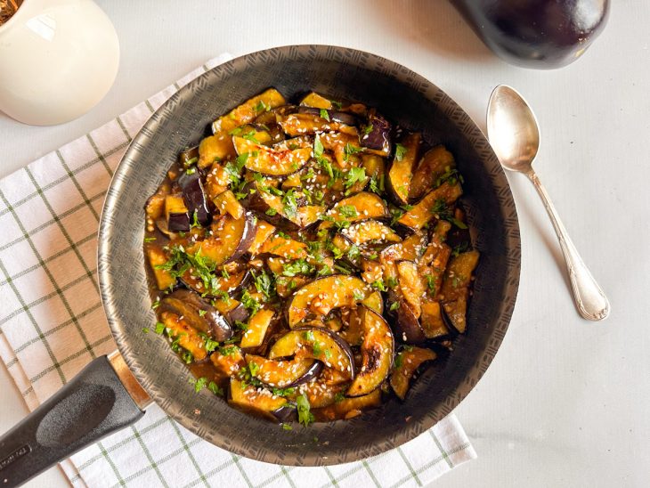 Para dar um toque agridoce na sua berinjela refogada, misture uma colher de chá de mel ao shoyu antes de levar tudo à frigideira. Essa combinação realça o sabor natural do legume e cria um molho levemente caramelizado. O resultado é uma preparação equilibrada, aromática e irresistível.