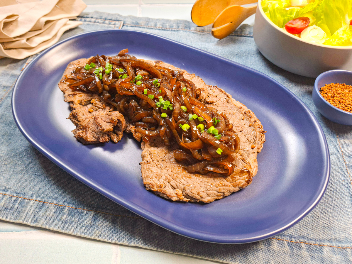 Para deixar o prato mais leve e equilibrado, finalize com cebolinha picada na hora de servir. Esse toque fresco contrasta muito bem com o sabor mais intenso da carne e da cebola dourada. Além disso, a cor vibrante da cebolinha deixa o prato visualmente mais apetitoso.