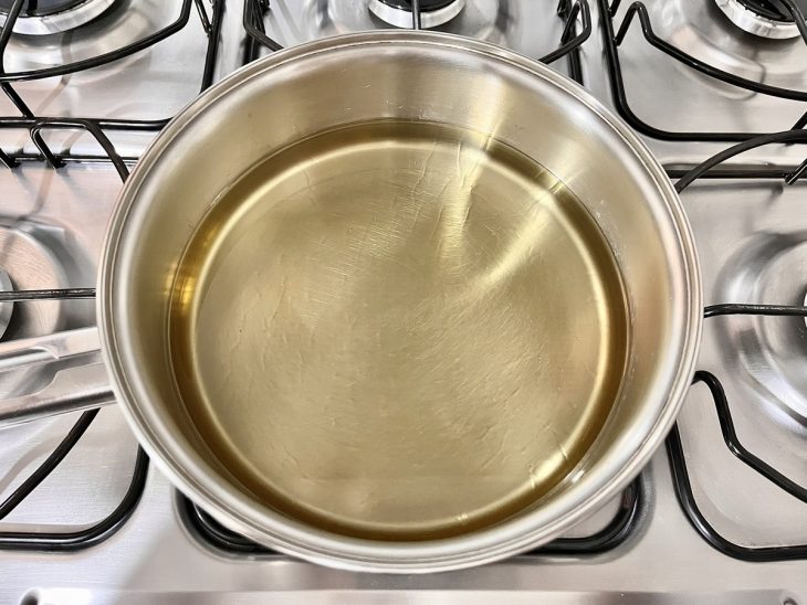 Coloque o óleo para aquecer em uma frigideira. Ele não pode ficar nem tão quente, nem tão frio, para que a casquinha não solte;