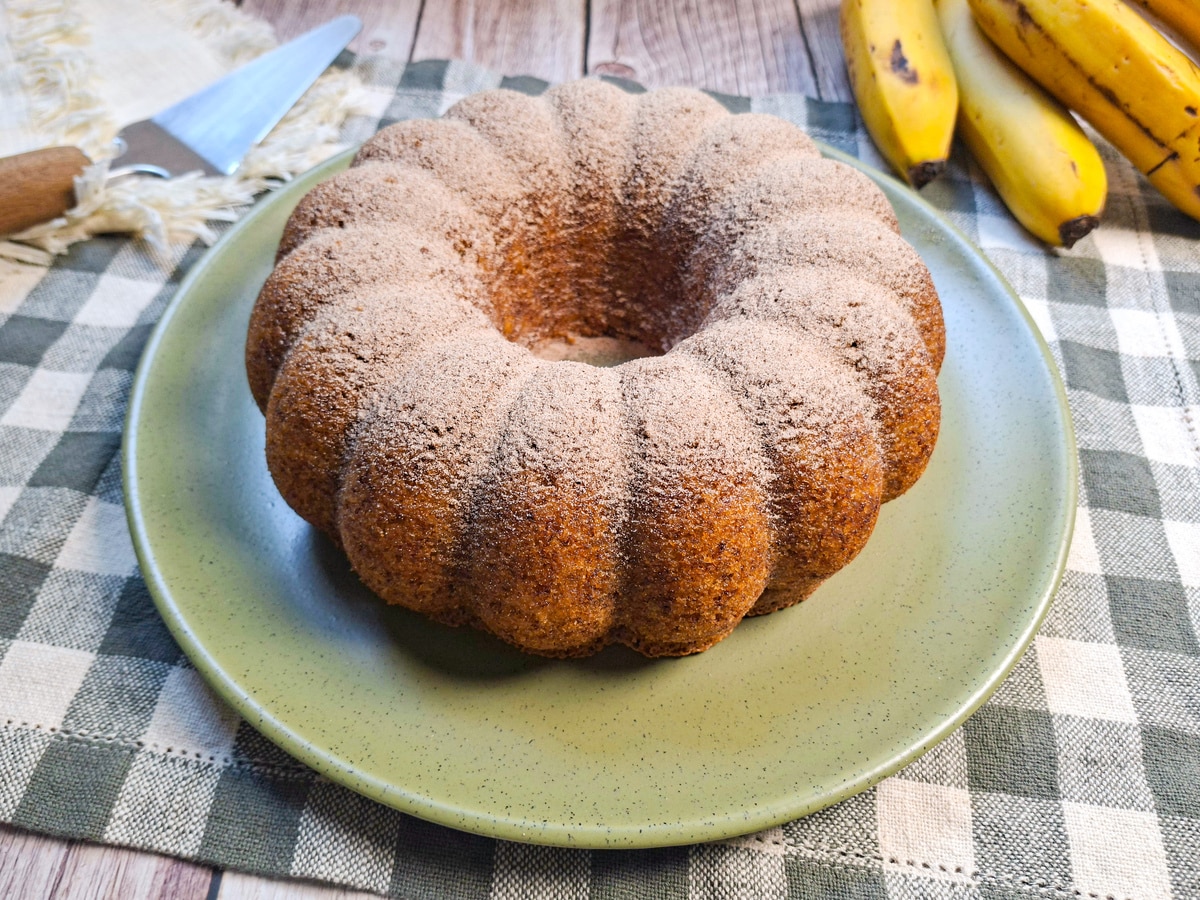 O bolo de banana ganha um toque especial nessa versão, preparada com farinha de rosca, que deixa a massa ainda mais macia e aproveita ingredientes simples do dia a dia. Para finalizar, a combinação clássica de açúcar com canela polvilhada por cima forma uma casquinha aromática irresistível, perfeita para acompanhar um café fresquinho.
