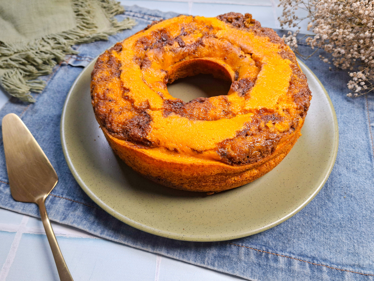 Se quiser variar, dá para adicionar um pouco de granulado à massa antes de levar ao forno, criando mais textura e um toque divertido. Outra dica importante é desenformar o bolo ainda morno, o que ajuda a manter a estrutura intacta e valoriza o efeito marmorizado do topo.