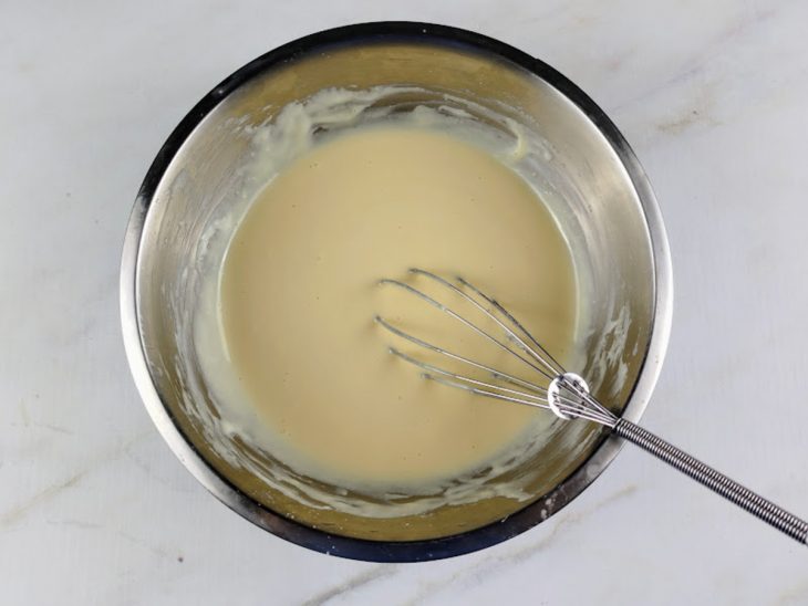 Em uma tigela grande, adicione o leite condensado, o creme de leite e o leite em pó. Com um fouet (batedor de arame), misture bem até obter um creme homogêneo e sem grumos;
