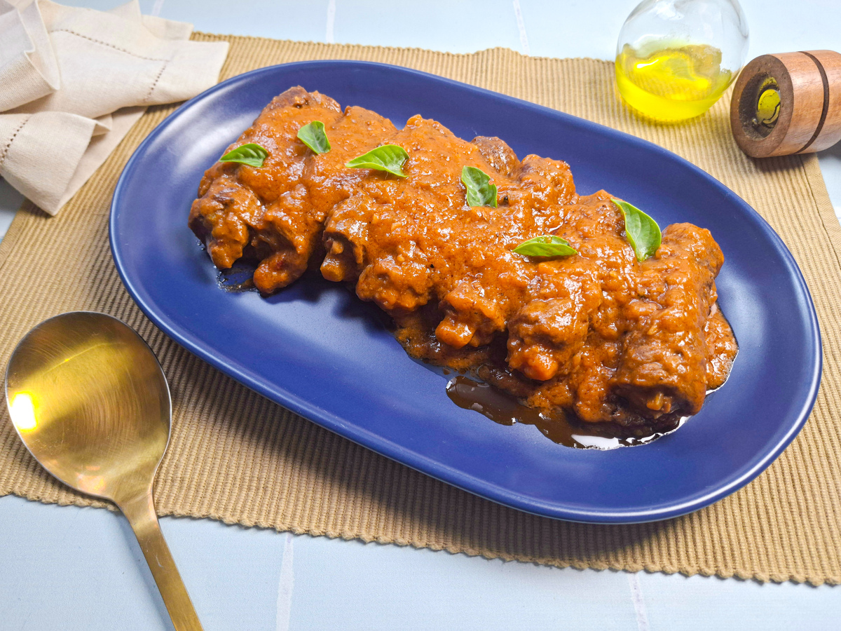 Clássico da cozinha italiana e inspirado no bife à rolê, a bracciola é um bife recheado, bem selado e cozido lentamente até ficar macio e suculento. Aqui, o recheio de bacon, cenoura e salsão traz sabor e textura, enquanto o molho encorpado transforma o prato em uma refeição reconfortante e cheia de personalidade.