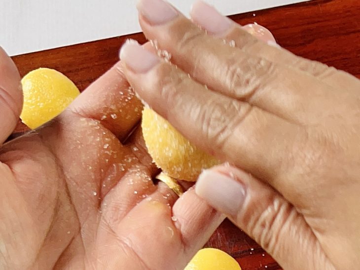 Unte levemente as mãos com margarina, pese porções de aproximadamente 25 gramas na balança e modele em bolinhas com as palmas das mãos;