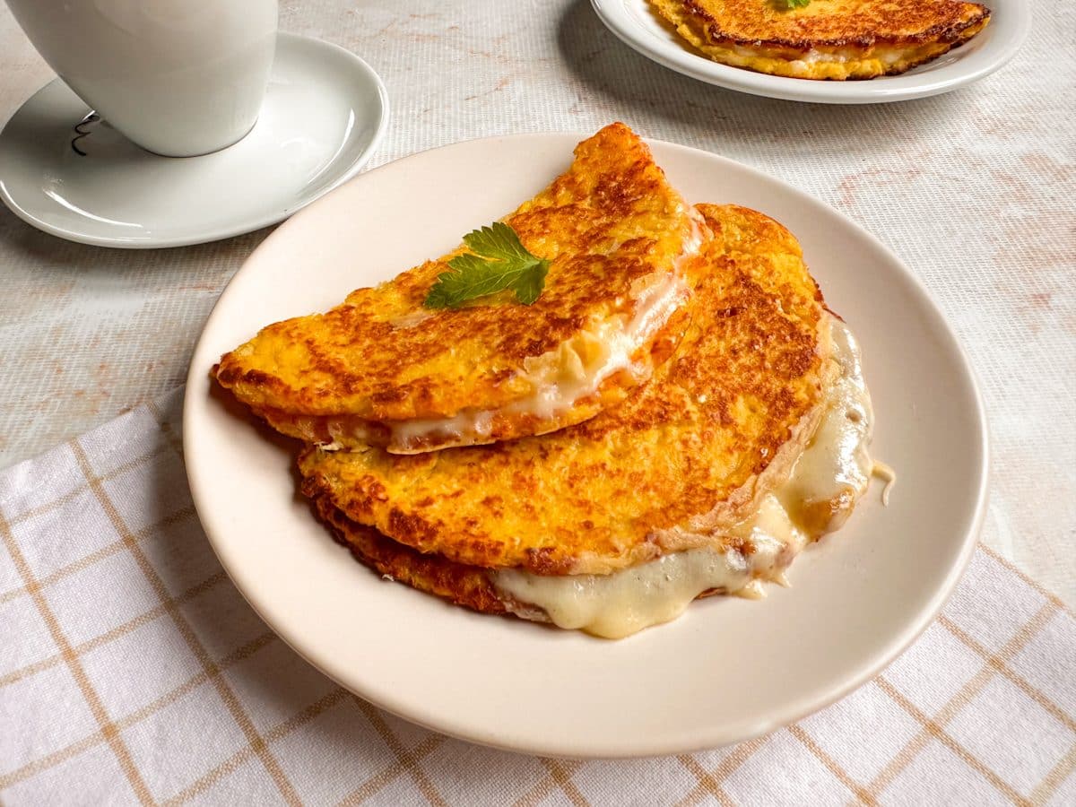 Recheie com o queijo e dobre ao meio. Deixe mais alguns segundos até o queijo começar a derreter. Retire da frigideira;