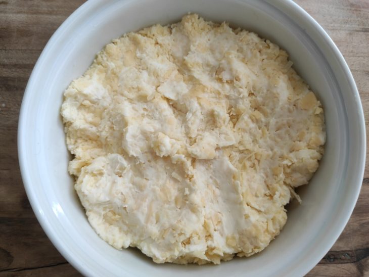 Em um recipiente, adicione o Catupiry, o parmesão ralado, o queijo gouda e misture bem e acerte o sal se precisar;