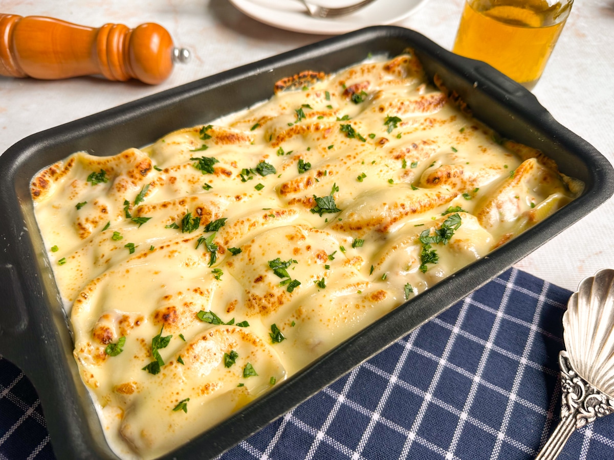 Espalhe o molho branco em uma travessa (39x26x5,5 cm) e disponha os conchigliones lado a lado, com o recheio virado para cima;