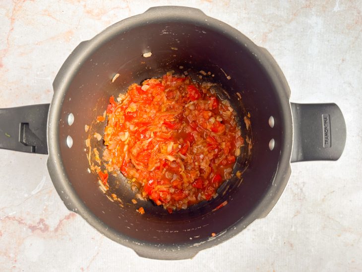 Junte o molho de tomate, temperando com páprica, cominho, pimenta, lemon pepper e chimichurri. Deixe ferver por cerca de 2 minutos;