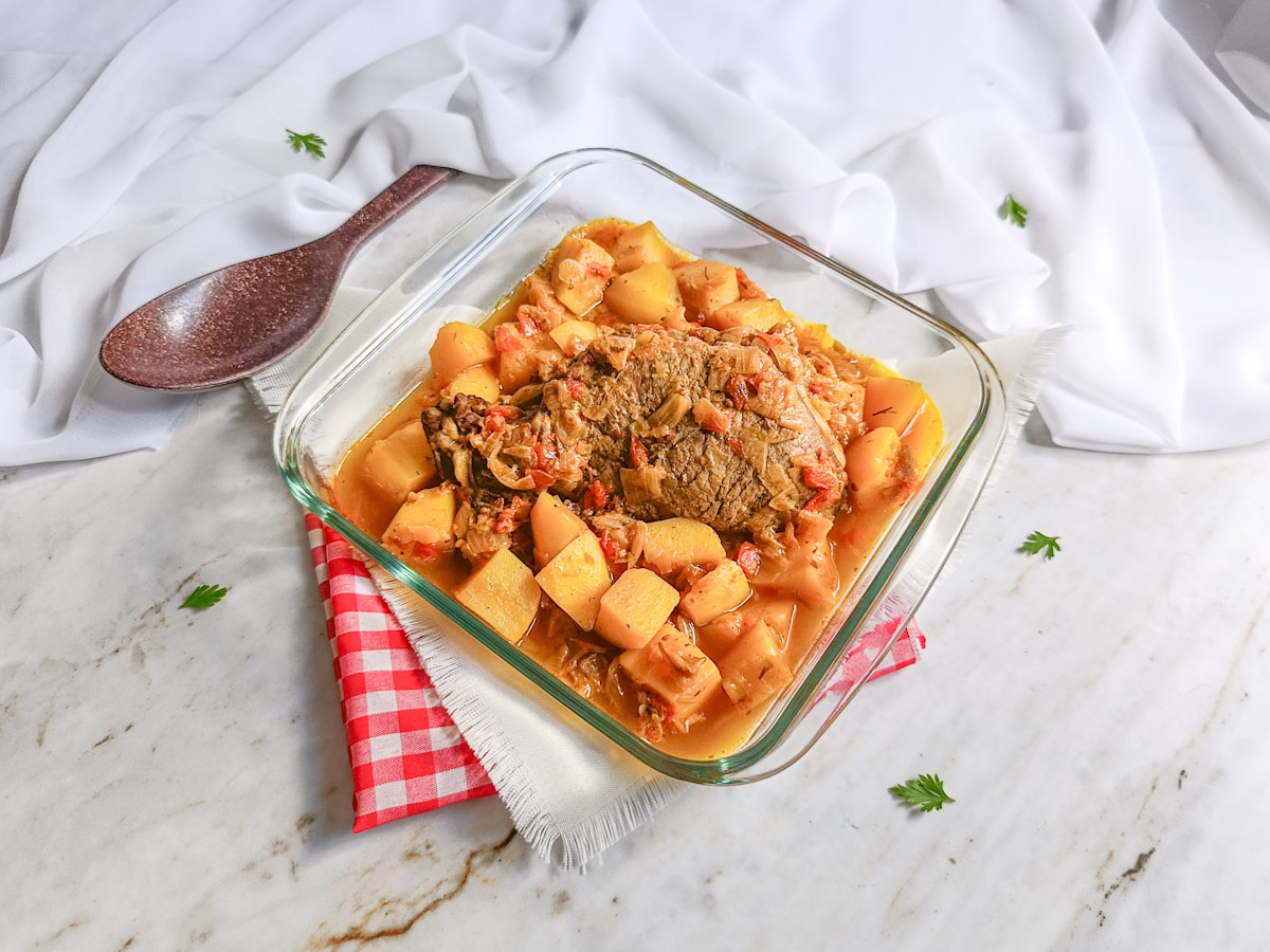 Para um bom resultado, vale cortar a carne em pedaços grandes, pois assim ela mantém a suculência e absorve melhor os temperos durante o cozimento. O tomate ajuda a formar um caldo encorpado, então use um tomate grande e com sementes. Antes de adicionar as batatas, prove o sal e ajuste se necessário.