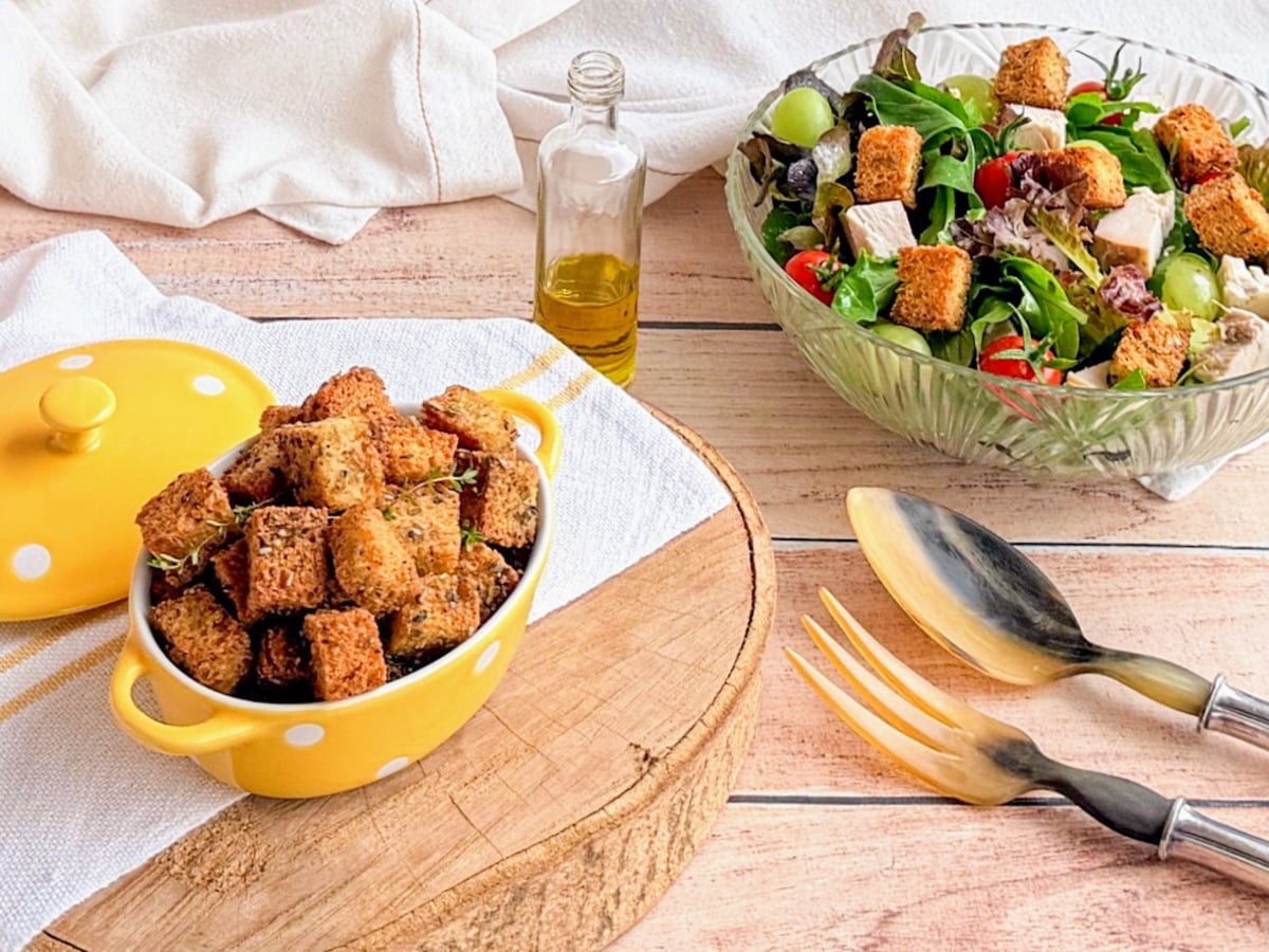 Perfeitos para dar crocância a saladas ou acompanhar sopas, esses croutons caseiros são fáceis de preparar e muito mais saborosos que os industrializados. Temperados com alho, chimichurri e azeite, ficam douradinhos e crocantes. Uma solução rápida e deliciosa para aproveitar sobras de pão!