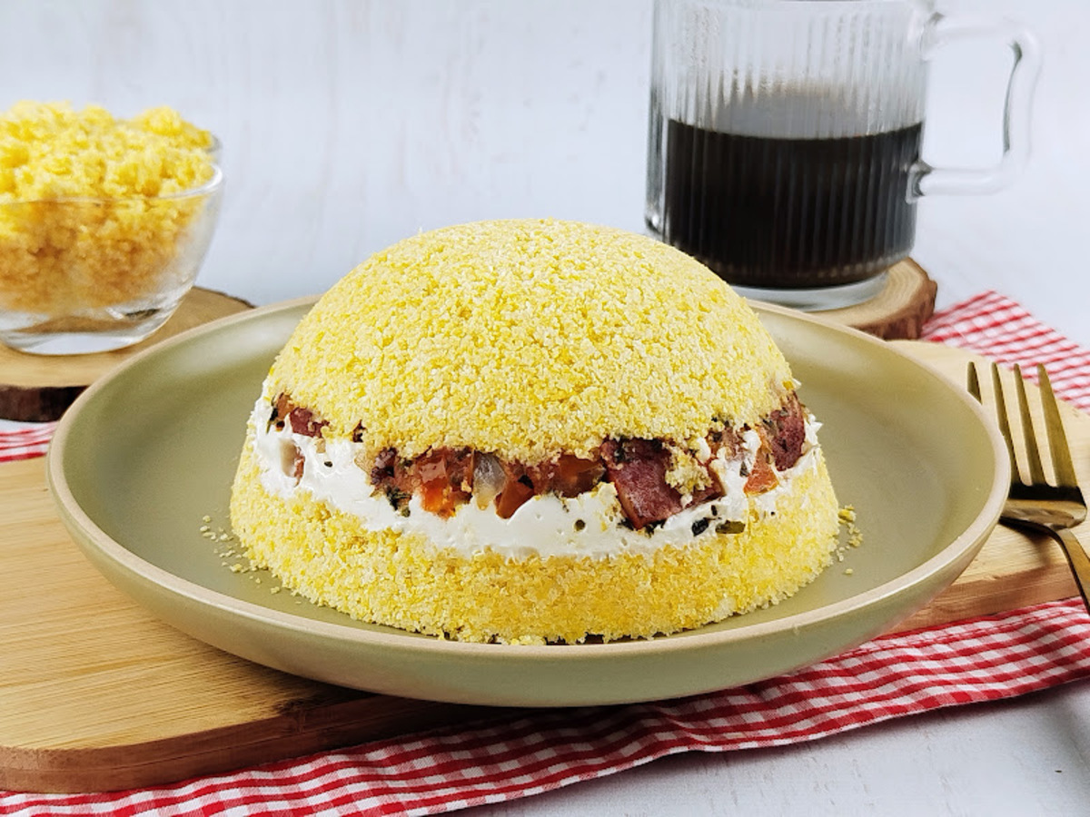 Que tal um cuscuz recheado pronto em poucos minutos? Essa opção é feita no micro-ondas e possui um recheio caprichado, perfeito para quem busca refeições rápidas e práticas para o dia a dia! Experimente servir com queijo coalho e banana-da-terra frita na manteiga.