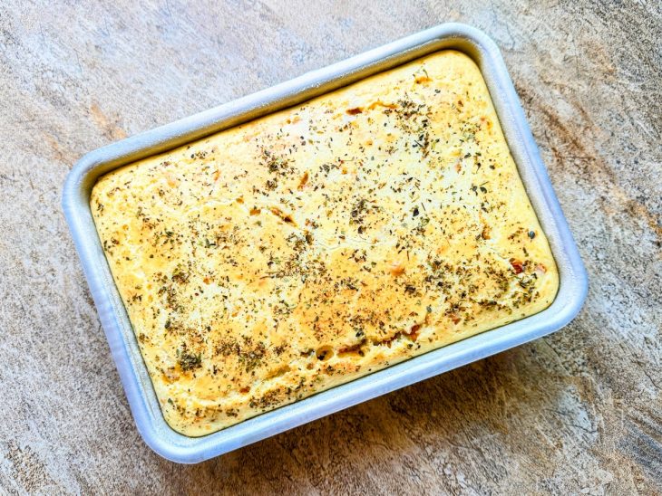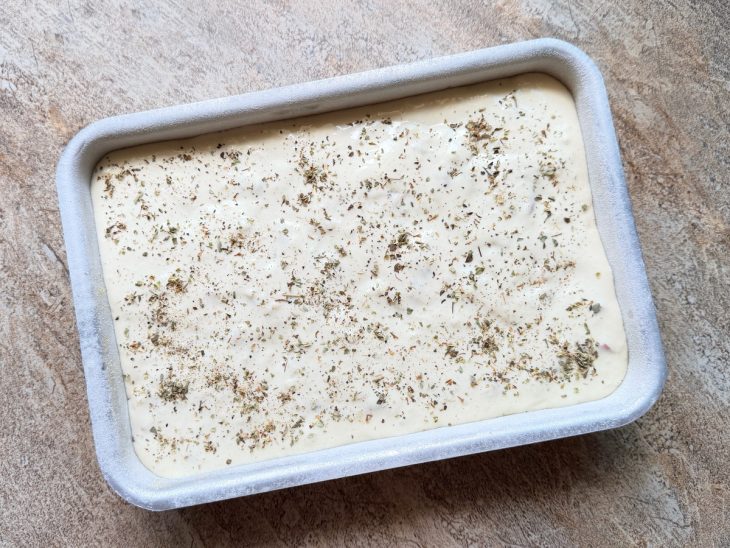 Cubra com o restante da massa e alise com uma espátula. Se desejar, finalize polvilhando orégano por cima;
