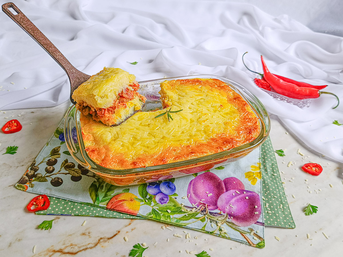 Para a montagem, em um refratário (29x18) untado com azeite, espalhe metade do purê;