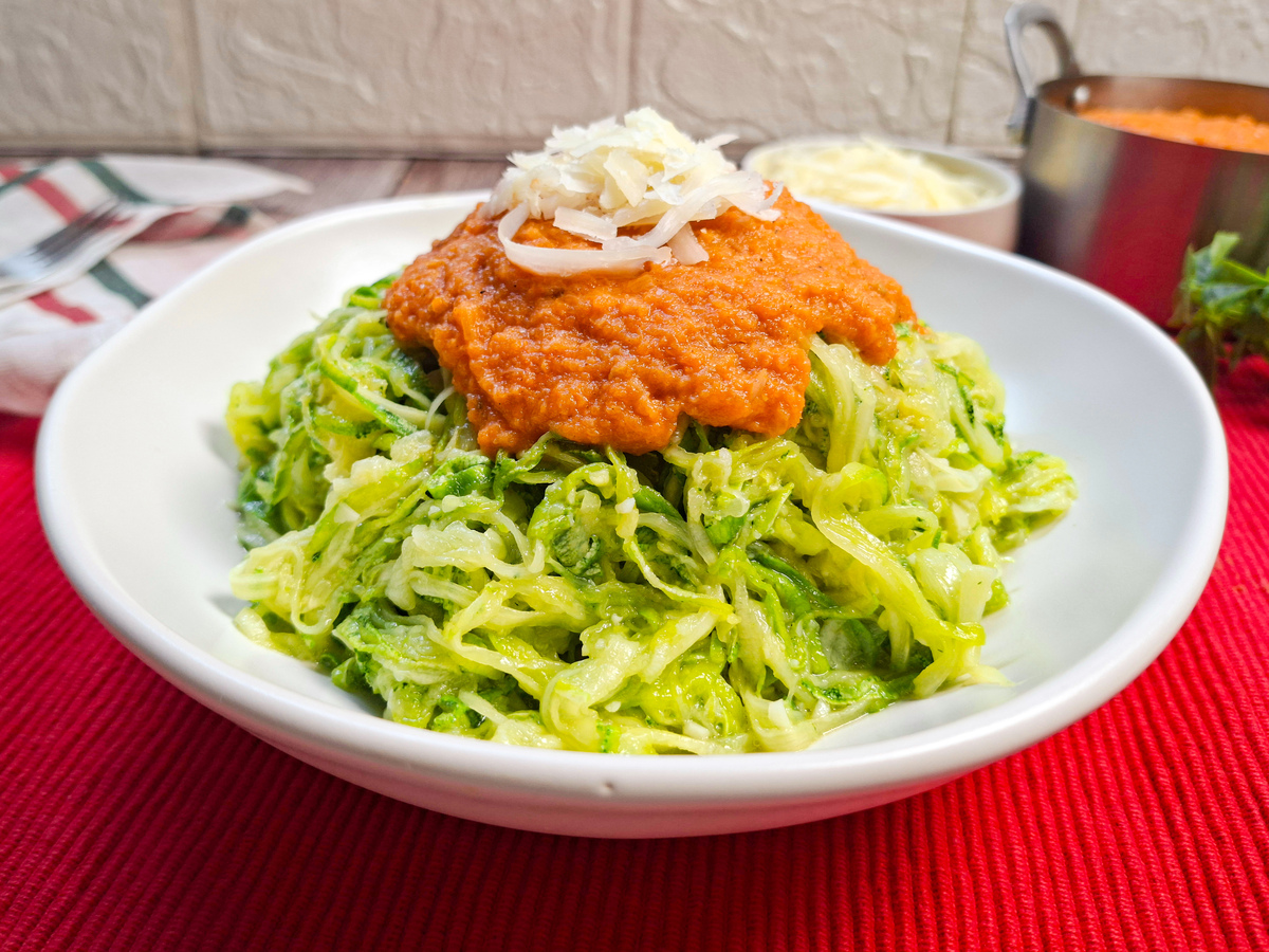 Em um prato, coloque o espaguete de abobrinha, uma porção do molho por cima e finalize com queijo parmesão ralado. Está pronto!