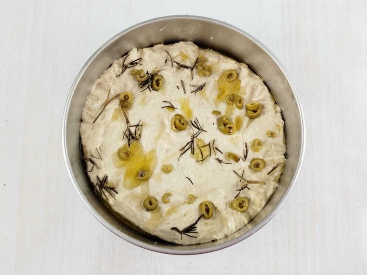 Unte com azeite ou óleo uma forma (22cm), disponha a massa e regue com azeite. Tampe com um pano e deixe descansar até dobrar de tamanho, cerca de 30 minutos;