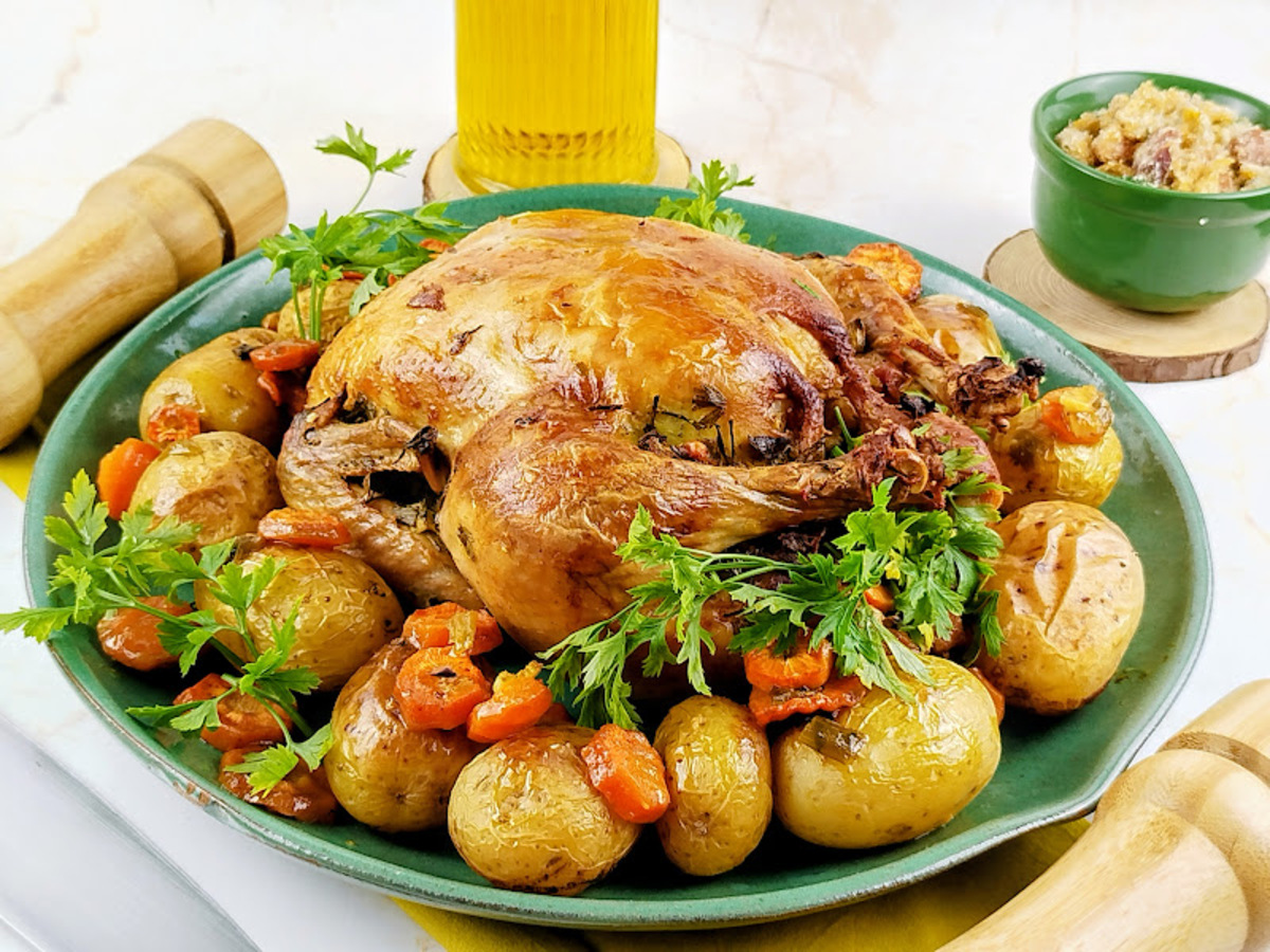 Venha aprender a fazer esse delicioso frango assado que acompanha legumes cheios de sabor. Aqui, não utilizamos os miúdos, mas você pode aproveitá-los e fazer uma farofa bem caprichada para rechear o frango e incrementar o prato. Lembre-se de retirar os palitinhos que fecham o frango.