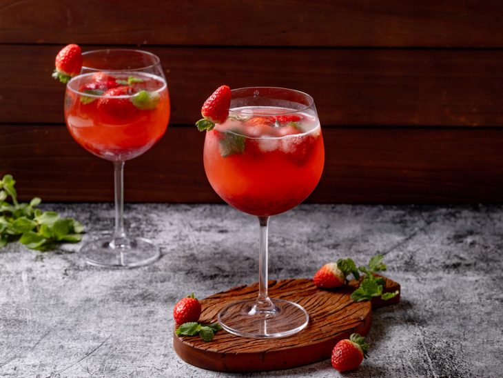 Para finalizar o seu drink de gin tônica com morango, decore o copo com moranguinhos encaixados na borda e algumas folhinhas de hortelã, para dar uma aromatizada na bebida. Experimente também adicionar rodelas de limão para um equiíbrio de sabores na bebida.