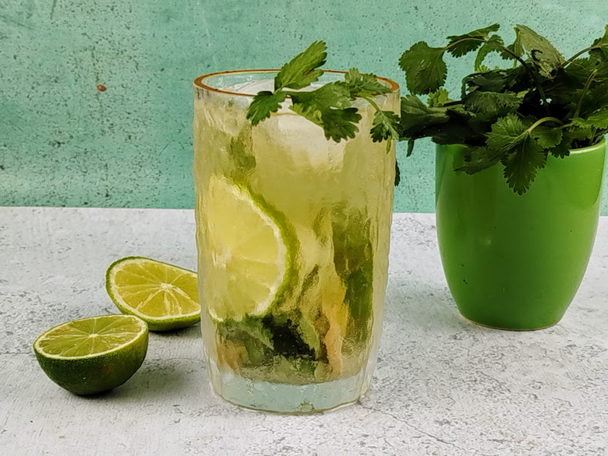 Agora, encha um copo alto com gelo e adicione as rodelas de limão, o coentro levemente amassado e as lascas de gengibre;