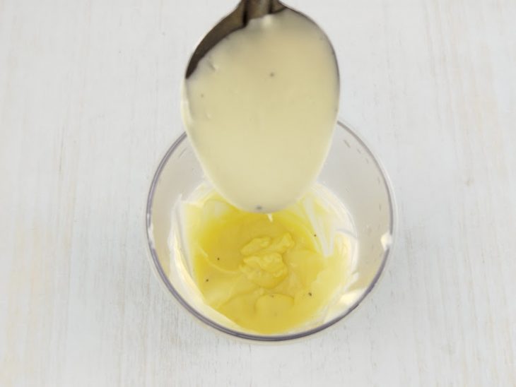 Com um fouet (batedor de arame), bata vigorosamente, adicionando óleo em fio, até atingir o ponto de maionese (se você tive um mixer de mão, usá-lo por alguns segundos ajuda a chegar no ponto mais rapidamente).