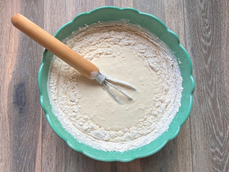 Transfira a mistura para uma tigela e adicione a farinha de trigo. Misture bem com um batedor de arame ou fouet até virar uma massa lisa;