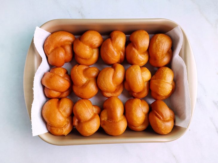 O ponto do óleo faz toda a diferença para o resultado. Antes de fritar, vale testar com um pedacinho da massa: se ele subir devagar e dourar aos poucos, está ideal. Frite poucos nozinhos por vez, sempre em fogo médio, para que cozinhem bem por dentro sem dourar rápido demais. Assim que saírem do óleo e escorrerem no papel-toalha, já jogue a calda e o coco para fixar melhor.