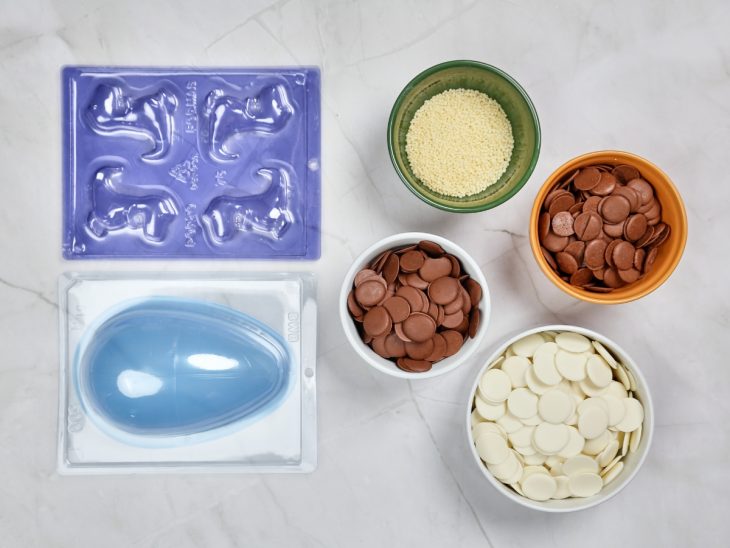 Coloque a cobertura de chocolate branco numa tigela que possa ir ao micro-ondas. Derreta em intervalos de 30 segundos, mexendo bem a cada intervalo. Preencha os moldes do Ovo de Páscoa com o chocolate branco, criando duas casquinhas;