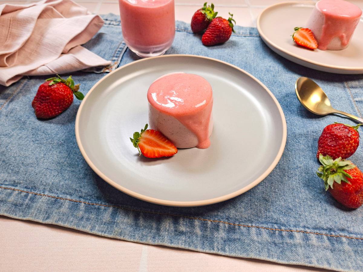 Após desenformar, finalize a panacota com essa cobertura e decore com mais morangos frescos a gosto.