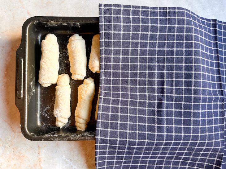 Abra cada porção com um rolo, e enrole como um pãozinho. Depois, cubra com um pano e deixe descansar por 20 minutos;
