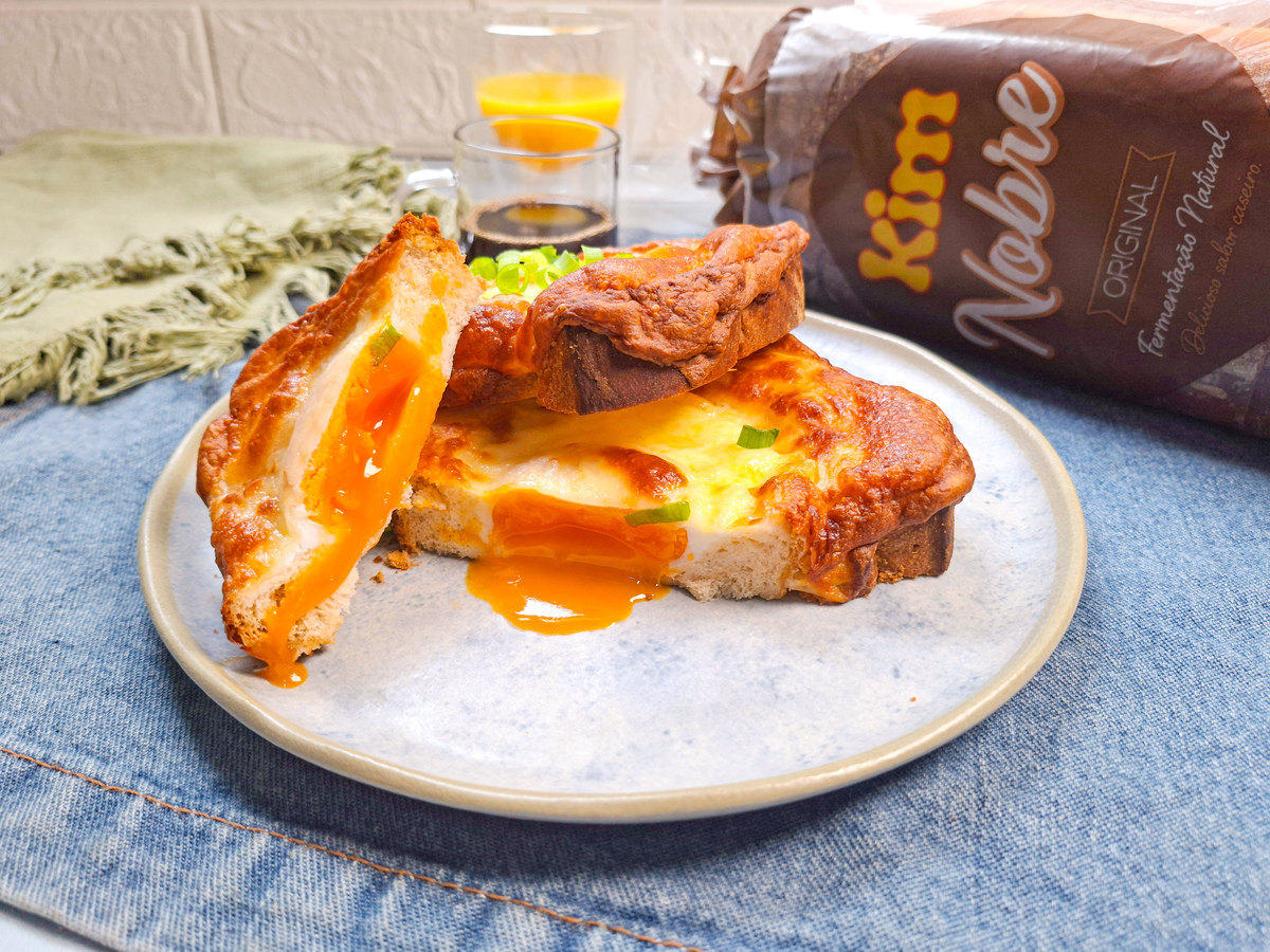 A fatia de pão deve ser um pouco mais grossa para acomodar bem o ovo sem que transborde. Por isso escolhemos o Pão de Forma Nobre Original da Kim, macio por dentro, com casca polvilhada por fora, feito com ingredientes selecionados e fatias mais grossas.