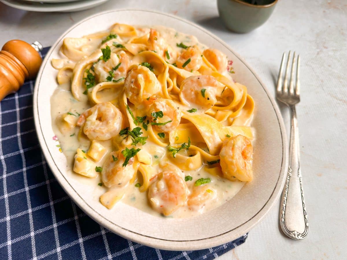 Celebre eventos e datas especiais com esse pappardelle delicioso! Envolvido por um molho branco cremoso e camarões bem refogados, ele tem um sabor irresistível que conquista na primeira garfada. Se quiser, acrescente outros temperos e ervas frescas de sua preferência e deixe ele do seu jeitinho!