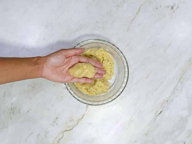 Avalie a textura da massa: se estiver muito úmida ou pegajosa, acrescente 1 colher de sopa de farinha e misture novamente. Ajuste conforme for necessário, até que ela pare de grudar nas mãos. Cuidado para não exagerar e a massa ficar seca demais;