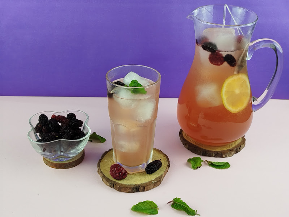 Quando o chá estiver gelado, adicione o suco de limão e a água gelada ou com gás (para um toque frisante). Misture bem e ajuste a doçura, se necessário;