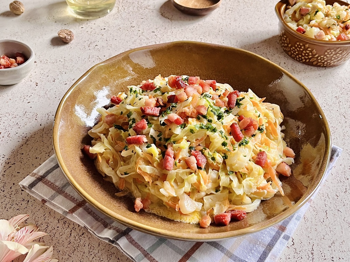Sabe aquele acompanhamento que some rápido da mesa? Esse repolho cremoso com bacon é assim. O vegetal fica macio, envolvido por um creme suave, enquanto o bacon traz contraste e sabor. Combina com refeições do dia a dia e também com aquele almoço caprichado para a família.