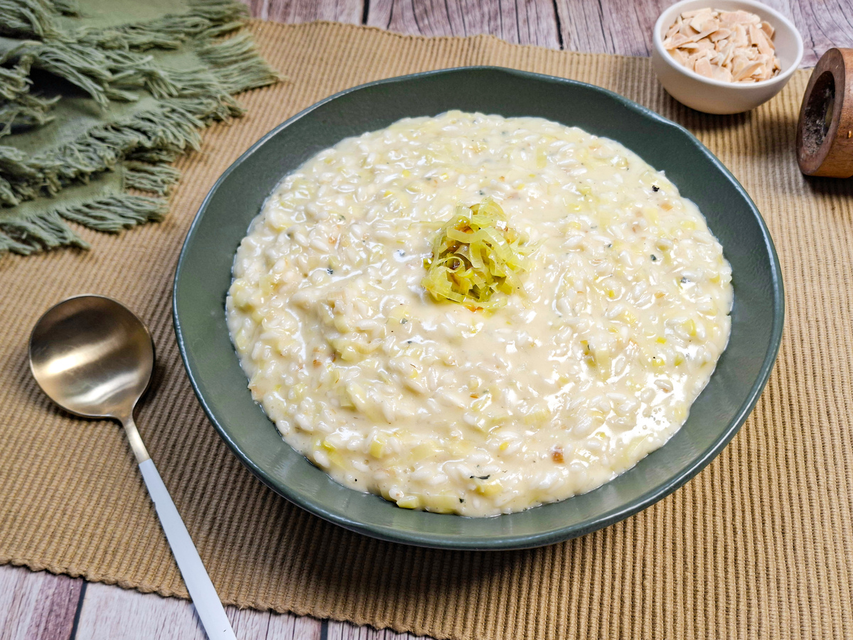 Cremoso, aromático e sofisticado, o risoto de alho-poró com gorgonzola combina delicadeza e intensidade. Ele é ideal para surpreender em almoços ou jantares do dia a dia, ou em ocasiões especiais.