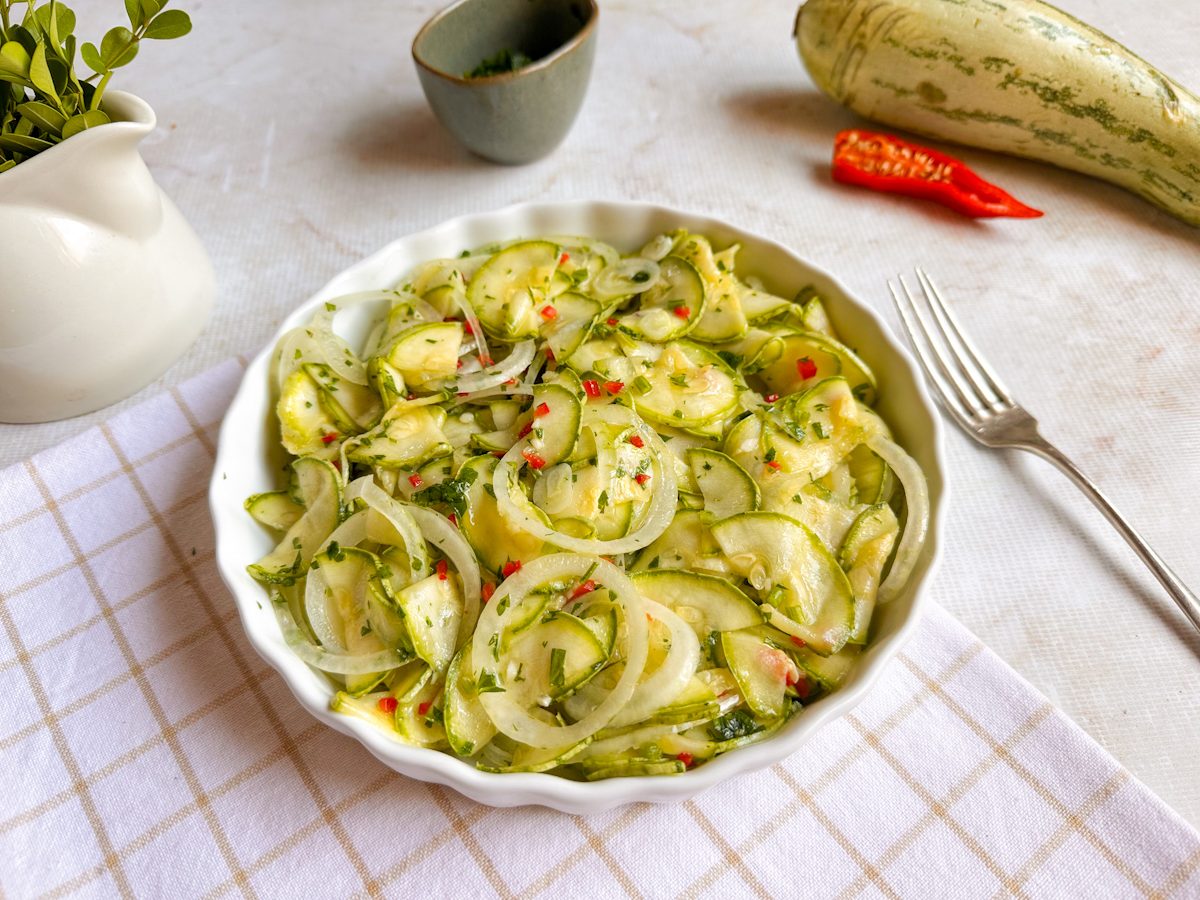 Se você está procurando uma salada diferente, prática e cheia de sabor, essa de abobrinha crua é uma excelente opção. O segredo está na desidratação da abobrinha com sal, que concentra o sabor e melhora a textura. Com cebola suavizada, pimenta dedo-de-moça e um temperinho simples, o resultado é leve e marcante ao mesmo tempo. Ideal para dias quentes ou como acompanhamento de grelhados.