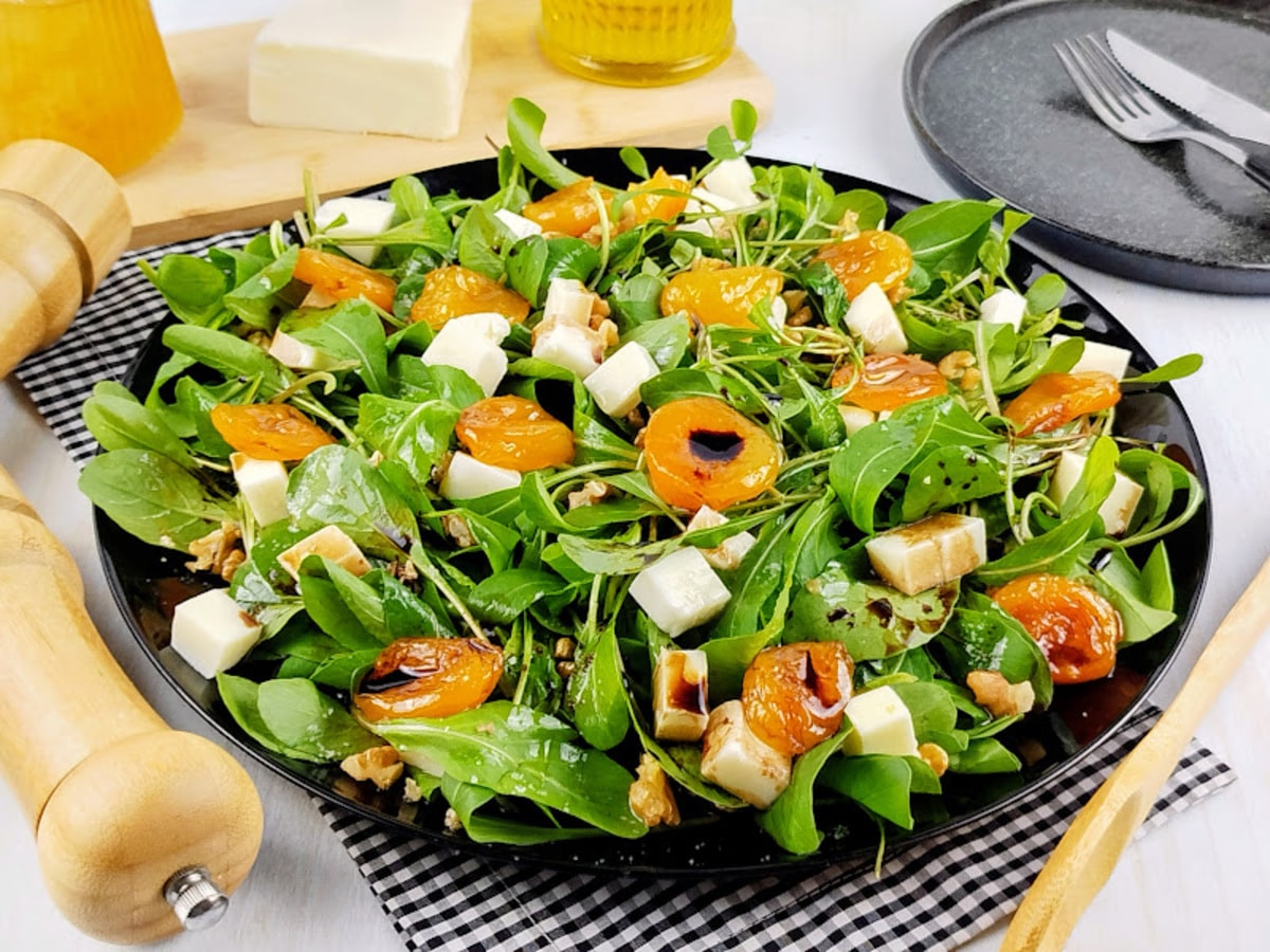 Com visual vibrante e sabor sofisticado, essa salada de rúcula com damascos é perfeita para impressionar em almoços especiais. A combinação do queijo de cabra cremoso com o damasco levemente grelhado e as nozes crocantes resulta em uma explosão de texturas. Tudo isso equilibrado pela doçura do mel e a acidez da redução de balsâmico.