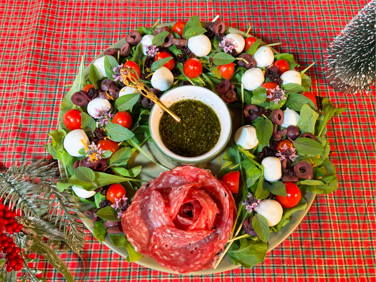 Quanto às substituições, a receita permite diversas adaptações sem perder sua essência. A mussarela de búfala pode ser trocada por mussarela fresca tradicional ou até por burrata em pedaços, para um toque mais cremoso. O salame pode ser substituído por presunto cru, copa ou até por uma versão vegetariana, como tomates secos ou fatias finas de abobrinha grelhada. Caso não tenha rúcula, folhas como agrião, mix de baby leaf ou alface roxa funcionam muito bem e mantêm a estética da guirlanda.