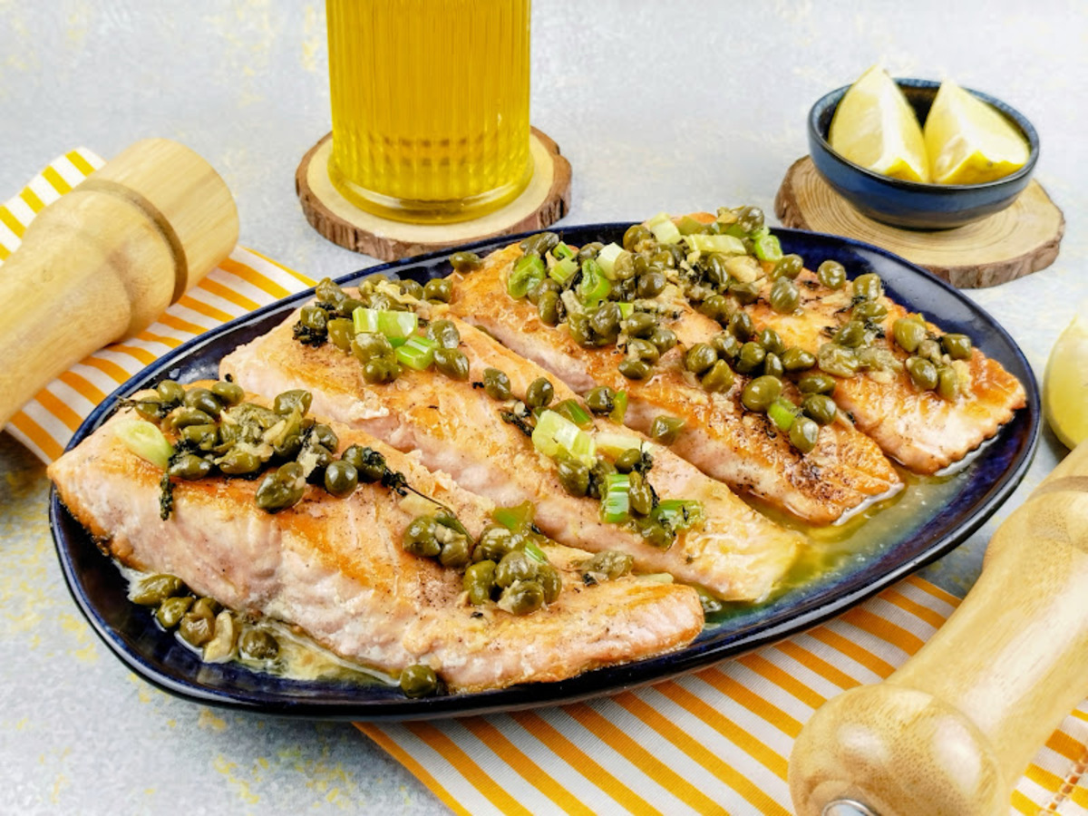 Suculento por dentro e dourado por fora, esse salmão é servido com molho de alcaparras para uma refeição ainda mais elegante! O toque cítrico do limão-siciliano no molho realça o peixe e traz frescor, enquanto a manteiga, junto das alcaparras, equilibra com cremosidade e um leve toque salgado.