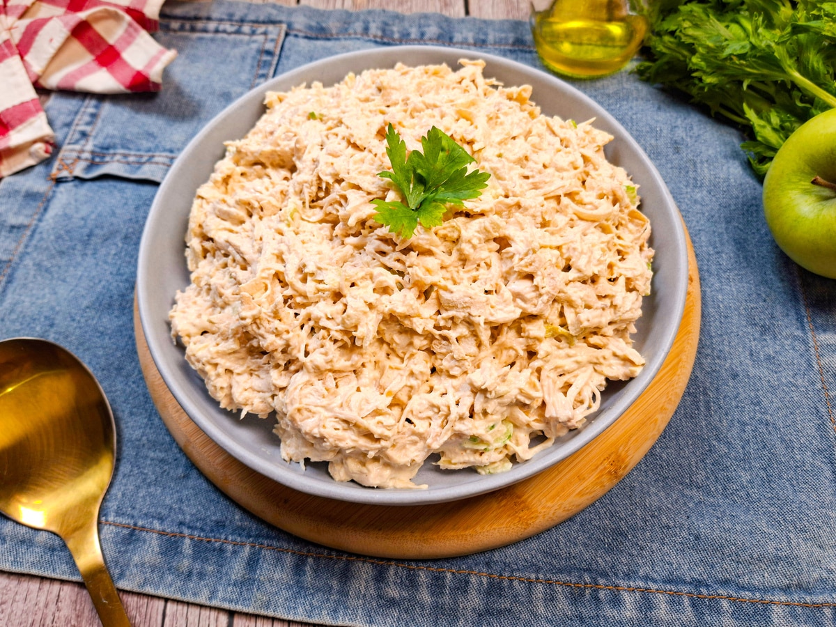 Em seguida, retire o frango do caldo e, com as mãos, comece a desfiá-lo em uma tigela. Adicione o sal, ajustando conforme sua preferência, e o salsão picado. Junte a maçã e misture bem;