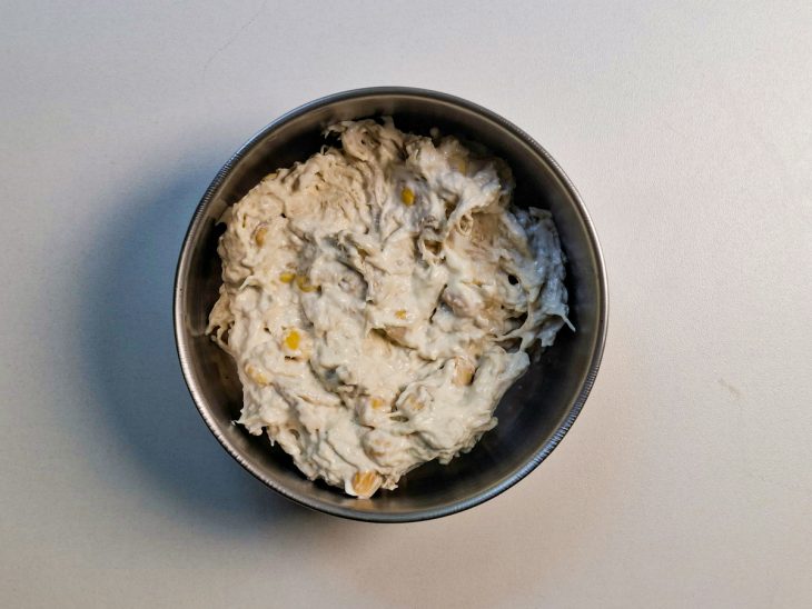 Em uma tigela pequena, coloque o frango desfiado, o creme de ricota e o milho-verde. Misture com uma colher até que todos os ingredientes se integrem;