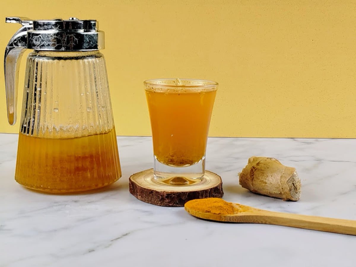 Esse shot mais que vitamínico foi preparado com uma infusão de mel, gengibre e cúrcuma, rica em sabor e benefícios. Esse tipo de combinação costuma ser fonte de vitaminas como C, D e zinco, além de não conter sódio nem cafeína.