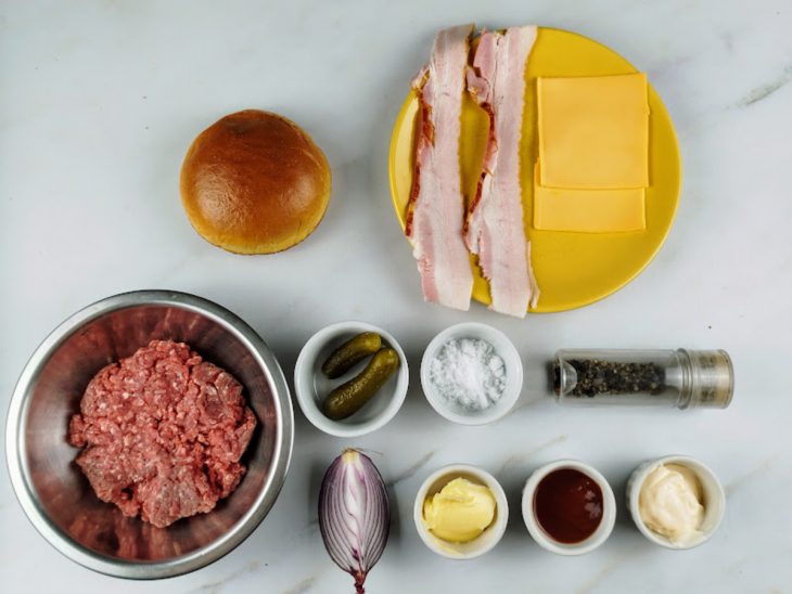 Descasque e corte a cebola em cubinhos. Corte o picles em rodelas. Divida a carne moída em duas bolinhas com cerca de 100 gramas cada. Corte o pão brioche ao meio. Separe todos os ingredientes na bancada para agilizar o preparo;