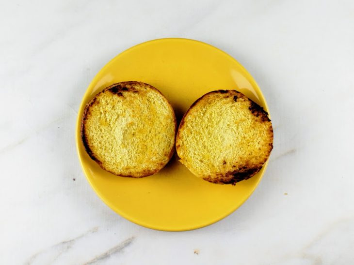 Enquanto o queijo derrete, em outra frigideira, derreta a manteiga e sele as duas metades do pão brioche até dourar. Retire da panela quando estiverem douradas;