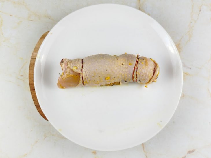 Passado esse tempo, retire-as da geladeira. Agora, junte uma tira de calabresa e uma fatia de bacon, e envolva a carne da sobrecoxa nelas, como se fosse um rocambole;