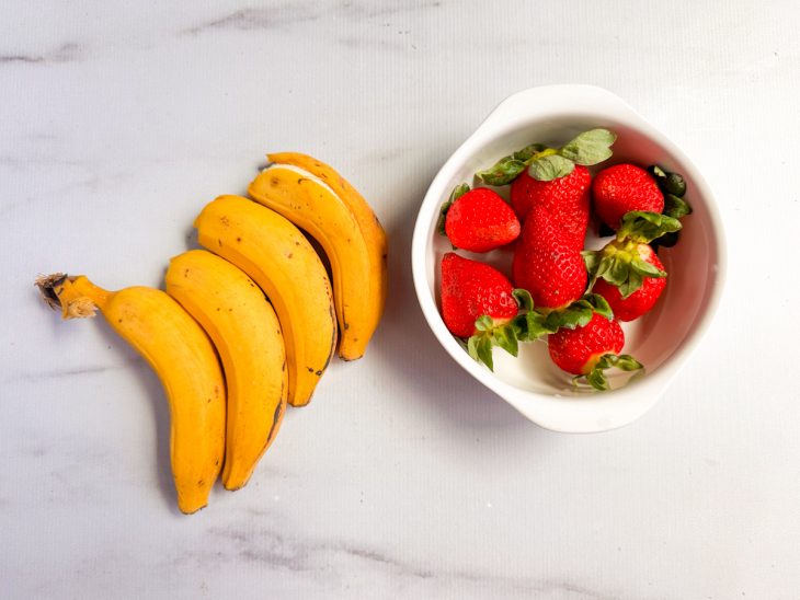 Corte previamente as bananas em rodelas grandes, e congele junto dos morangos;