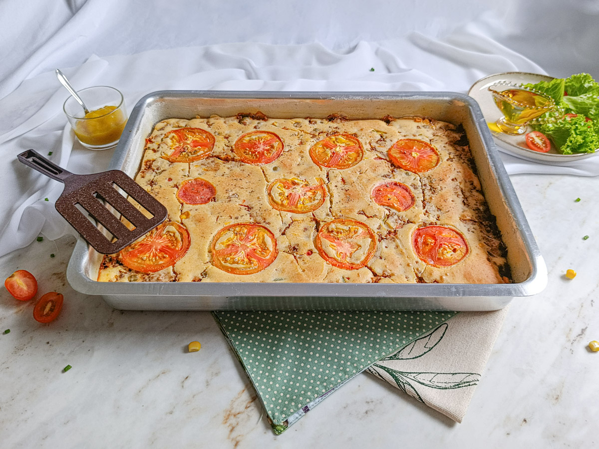 Cubra com todo o recheio e finalize com o restante da massa, nivelando com uma espátula. Decore com rodelas de tomate, ramos de orégano e um fio de azeite. Leve ao forno preaquecido a 180 °C por cerca de 45 minutos, ou até dourar;